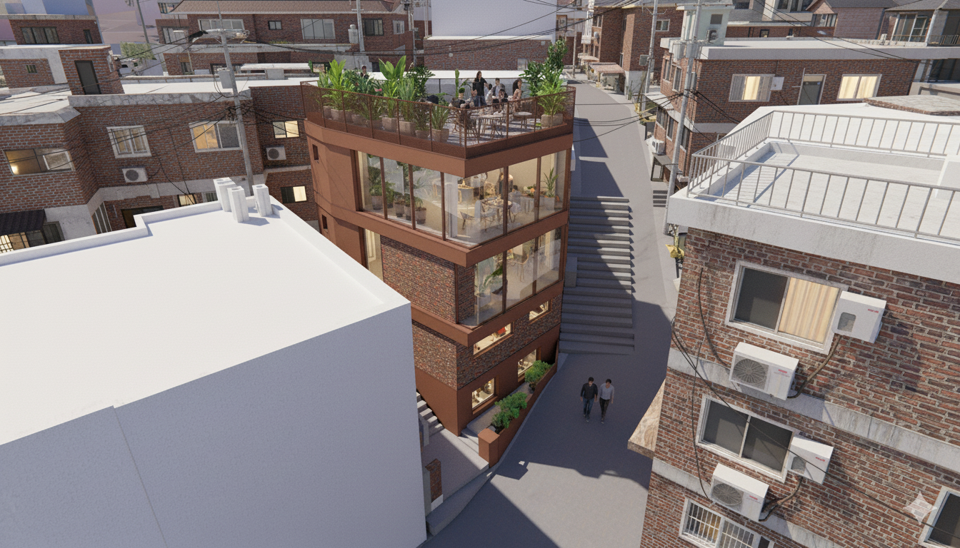 이 프로젝트의 핵심은 '붉은 코어'라 불릴 수 있는 외부의 나선형 계단입니다. 협소한 비정형 대지의 효율성을 극대화하기 위해 수직 동선을 과감히 밖으로 빼내, 건물 전체를 감싸고 오르도록 했습니다. 이는 단순한 동선을 넘어, 닫혀있던 주택이 활기찬 상업 공간으로 재탄생했음을 알리는 강력한 '조형적 랜드마크'가 됩니다. 골목의 흐름을 옥상까지 수직으로 연결하는 이 계단은, 방문객에게 도시의 풍경을 점진적으로 받아들이는 특별한 '시퀀스(Sequence)'를 제공합니다.